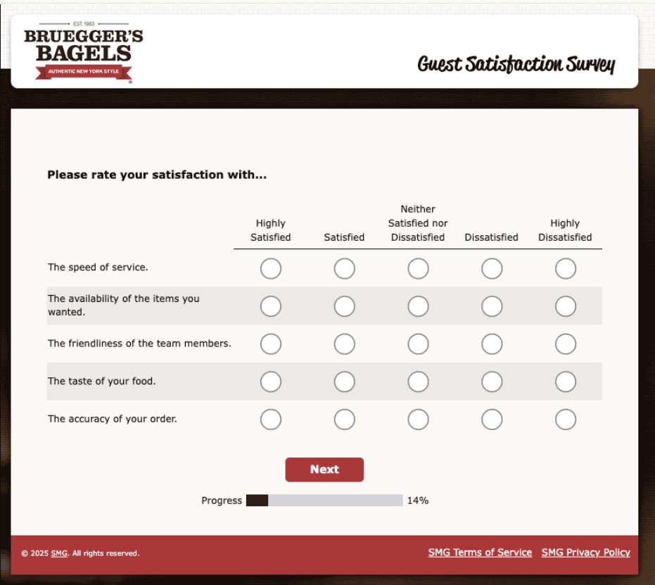 The brueggers survey asks multiple-choice and rating-style questions about your general satisfaction, staff friendliness, order accuracy, store usability, food quality, and cleanliness. Honest feedback helps improve both the products and service at Bruegger’s Bagels.