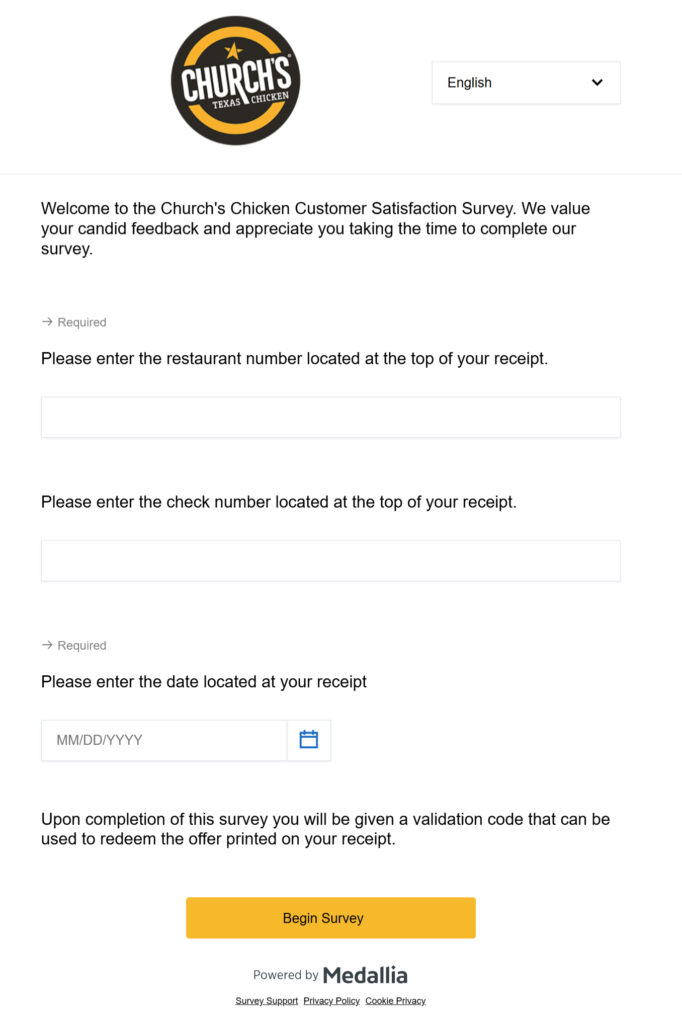 - You’ll require a recent Church’s Chicken receipt with a survey code