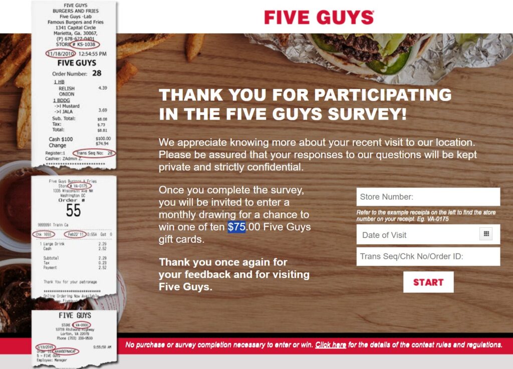 Once you complete the Fiveguys.com/survey, you will be invited to enter a monthly drawing for a chance to win one of ten $75.00 Five Guys gift cards.