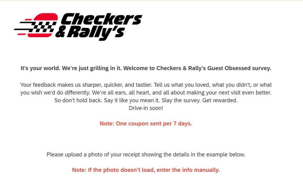 Yes, you must have made a qualifying purchase at a Checkers or Rally’s restaurant location to get a purchase receipt with the survey code. The receipt is valid for survey participation for up to 7 days after the visit. The survey reward coupon is then valid for about 30 days after survey completion.