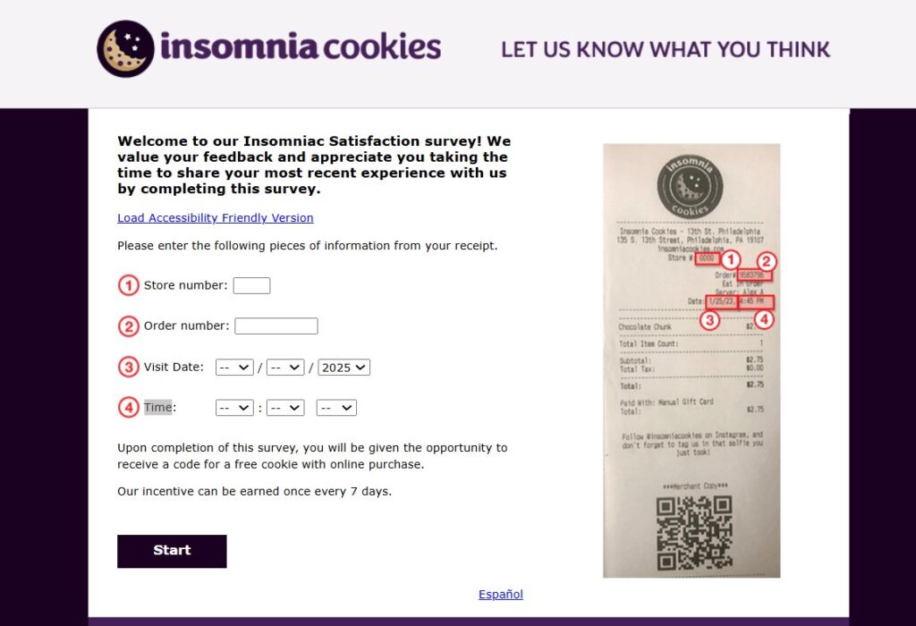 In most cases, survey participants receive a validation code or special offer—such as a discount or a free cookie on their next visit—as a thank-you for completing the Insomnia Cookies guest experience survey. The specific reward is mentioned on the survey invitation or receipt.