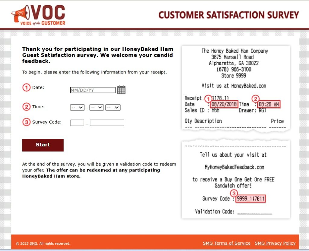 You must have a valid, recent Honey Baked Ham purchase receipt containing a survey code. Participants must also be at least 18 years old and a legal resident of the country where the Honey Baked Ham survey is held.