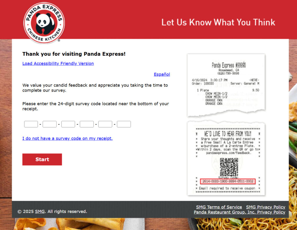 - Use a recent Panda Express receipt with a Panda Express survey code (don’t worry if it’s missing; we’ll cover that later!).